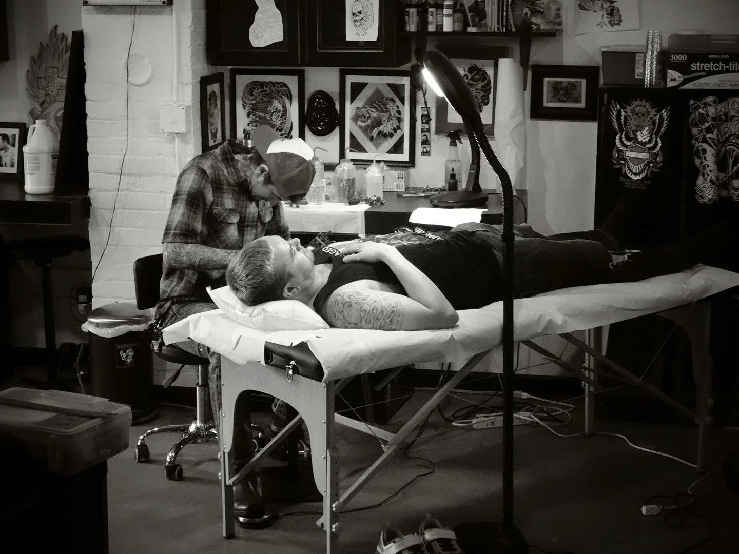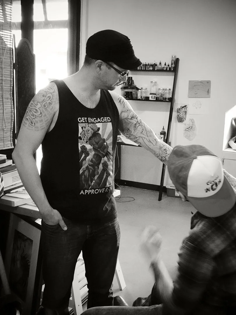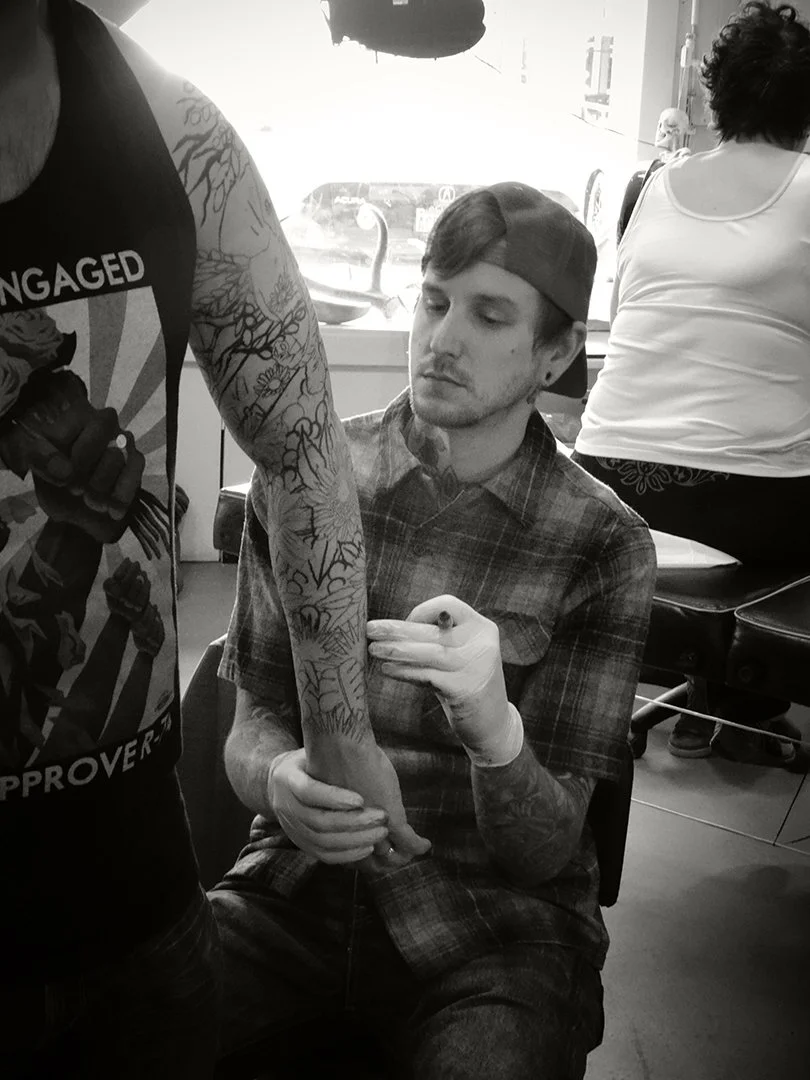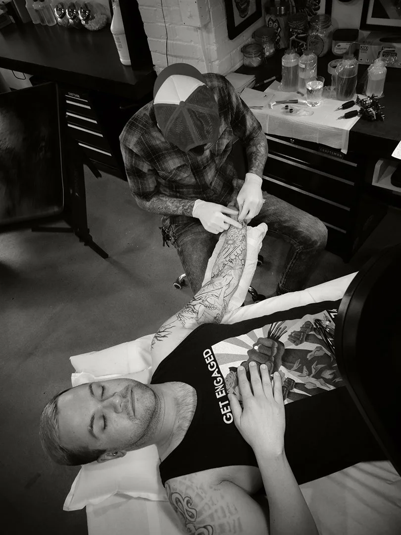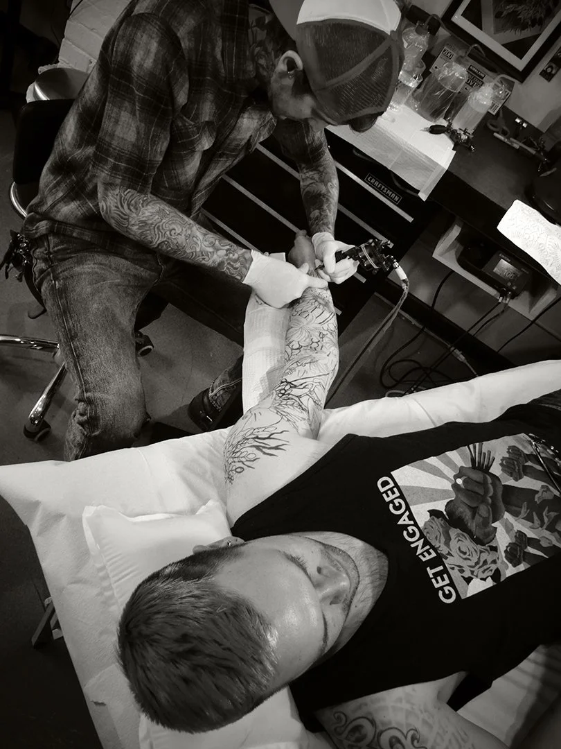 Getting Ink Feb 28 Written By Kenn Aguilar I decided to follow my husband in for their sleeve tattoo, in 2014. Photographed in color but I like how they render in monochrome (as always, shock). It was a long day, but the result was and still is beautiful. Kenn Aguilar